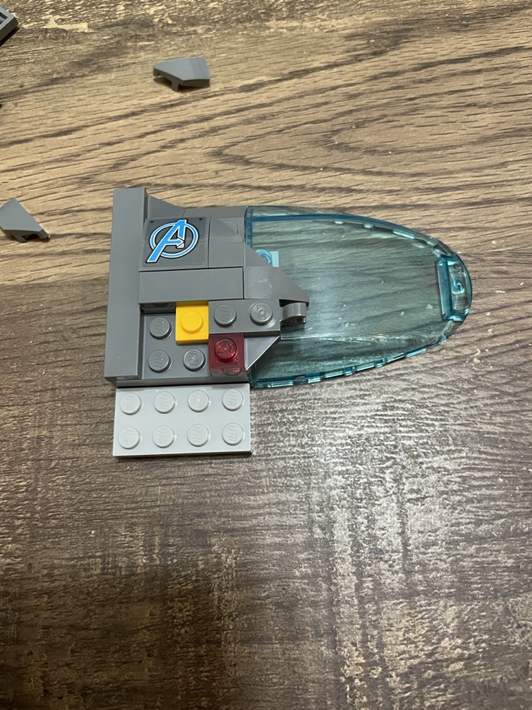 The sides of the cockpit are the next segments, and each side is a mirror construct of the other. First, several light and dark grey plates are stacked to generate the base. The transparent blue windshield, dark grey slopes, and a 1×6 tile are next. On top of this base, additional rectangular and curved sloped tiles smooth the edges and cover the studs. One curved tile has an Avengers sticker element. Next, a transparent red 1×1 plate and a dark grey modified plate with a clip were then covered with a 2×3 rounded tile slope.