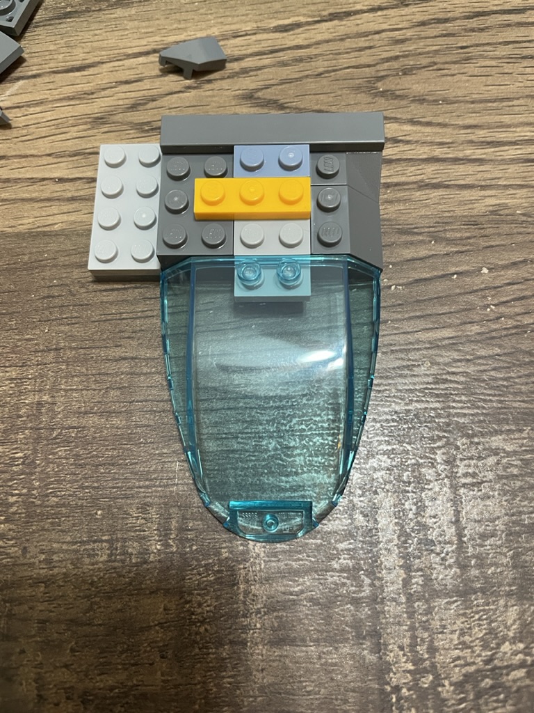 To the clip, a few hinged pieces are placed together and finished with a rounded slope to cover the bottom section of the blue window. Finally, the remaining exposed studs are coved with a 1×8 curved slope, slopped grill, and a final dark grey slope. These are added to each side of the cockpit with a transparent blue cockpit cover on the top.