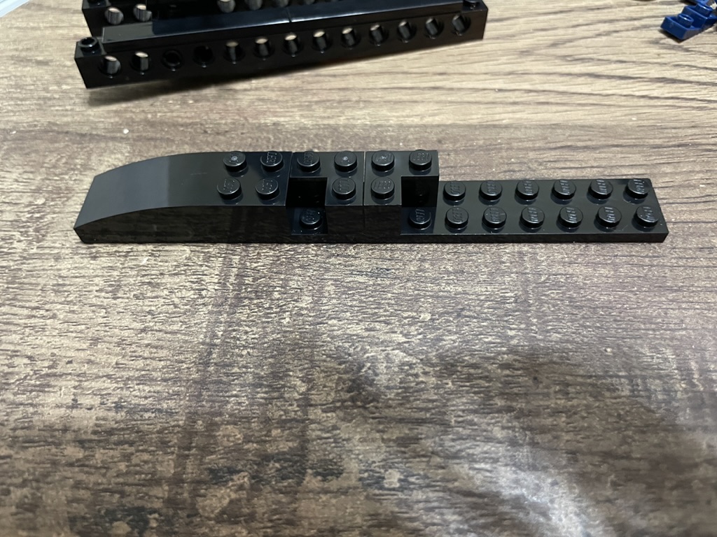 Wing construction begins with a layer of plates of various colors with a couple of clips at one end. Once flipped, further plates are added. At the chassis end, technic bricks have two blue pins inserted. These will attach to the fuselage. Further plates, mainly 2×2 dark blue, are added to anchor additional dark grey triangular plates that frame the wing.