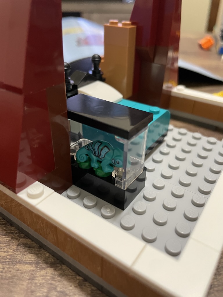 Despite the absurdity, the bed looks fantastic – I particularly appreciate the microphones used in the headrest. Next to it is an aquarium with a chameleon. This is a new piece for me, and I love the look of it.