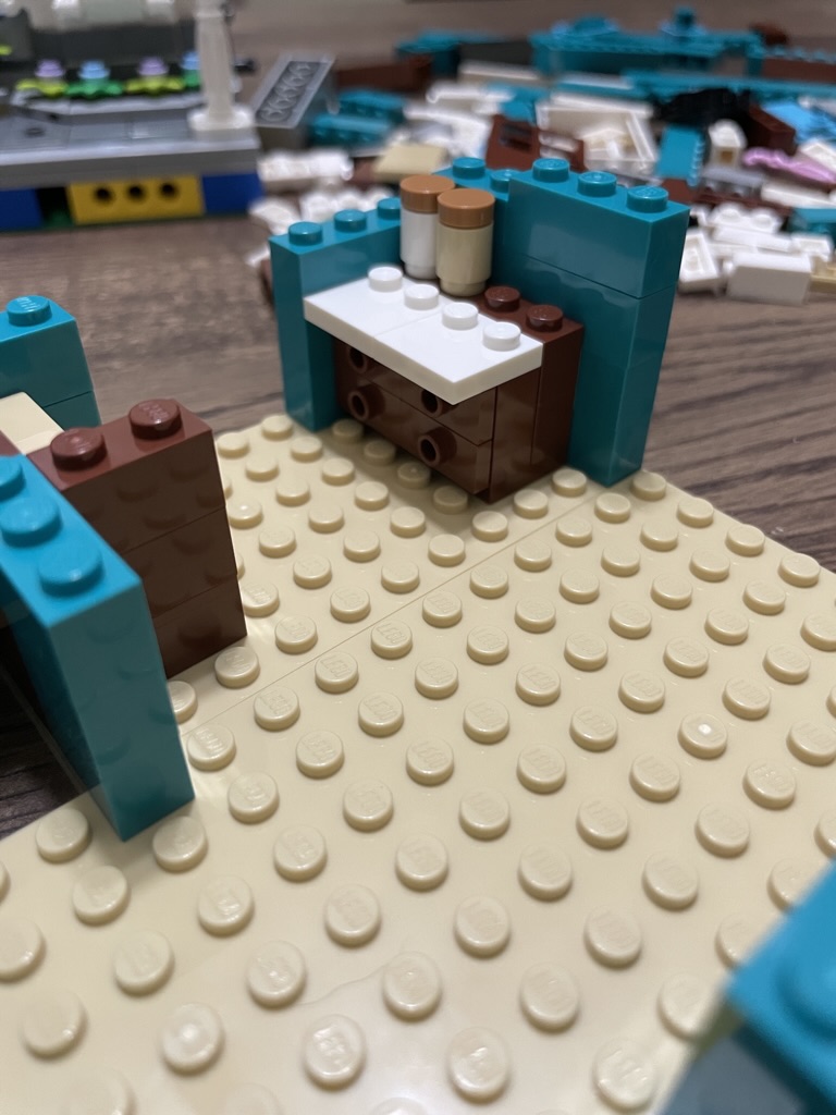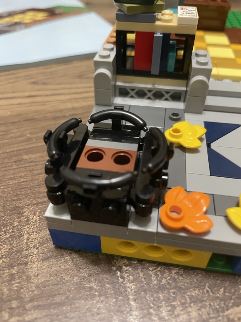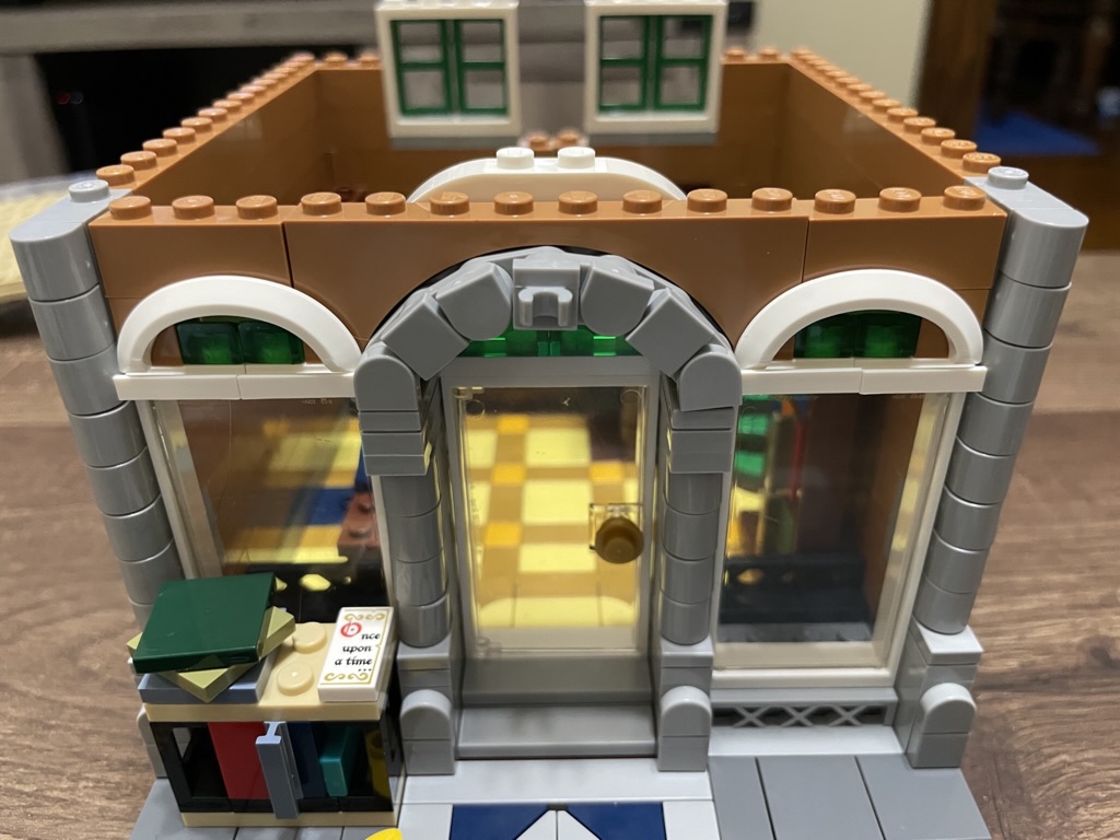 When I added the large front windows, I realized I’d placed my exterior book display in the wrong place, so it is in its correct position now! The large windows make this building immediately identifiable as a store. Both windows have two transparent green cheese wedges on top that look like stained glass when the surrounding pieces are in place. Two transparent green bricks will also be placed above the door to create the same effect.