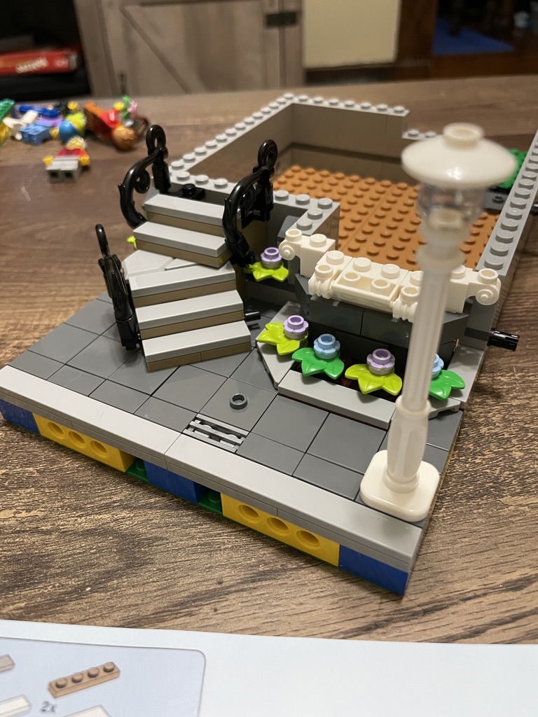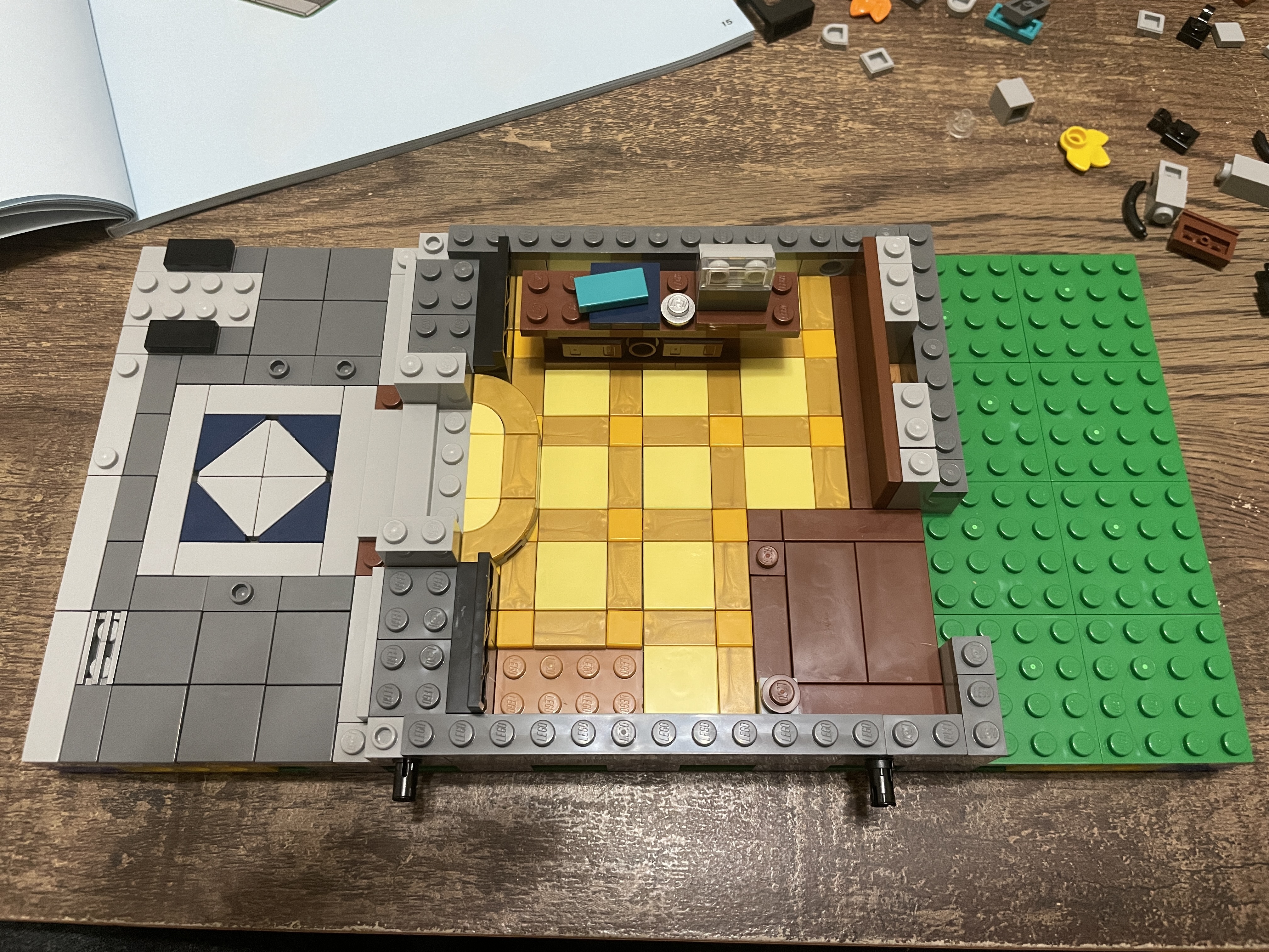 Once again, I am starting with my half MILS base plate, and later you will see why I wanted to change the green. The tiling at the front of the house is similar to other modular buildings with a one-stud line of light grey tile, a grill piece for a drain, and dark grey tile for the pavement. A 2×2 dark grey plate sits at the corner as the anchor for the lamppost, and a jumper tile is placed too.