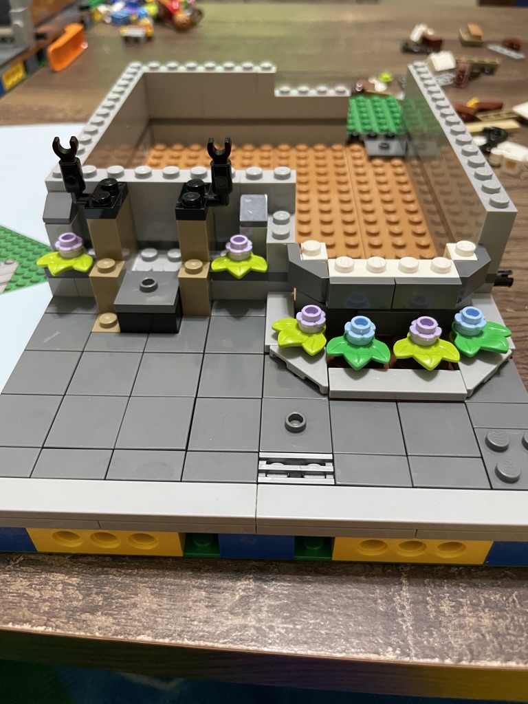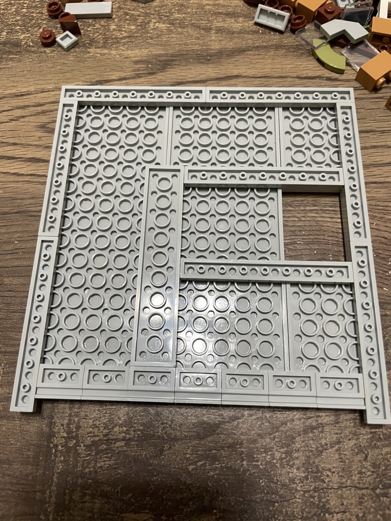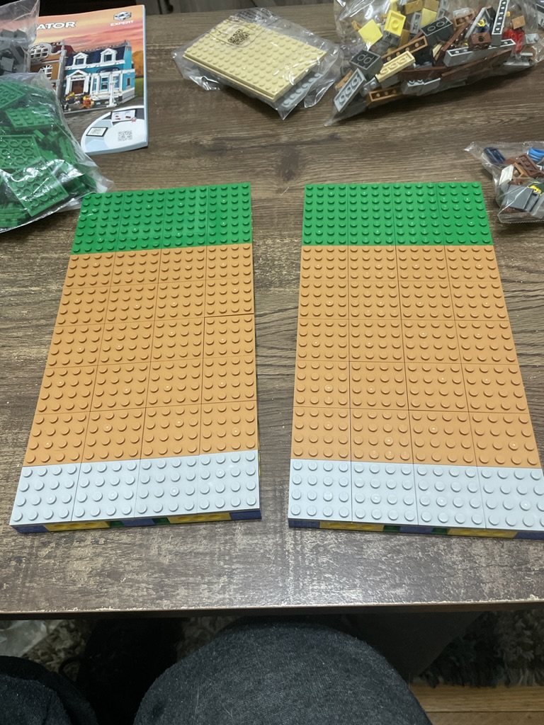 My first decision was debating the color of the apartment’s basement floor on my MILS plate. The set comes on green baseplates, but a green basement floor makes zero sense to me, so I had to select a more suitable color from my inventory. I went for medium nougat plates and kept both baseplates the same, even though most of the color does not matter. I retained the green at the back as some plates are left exposed. I could have made one large baseplate; however, keeping them separate will allow greater versatility when placing these buildings in the city.