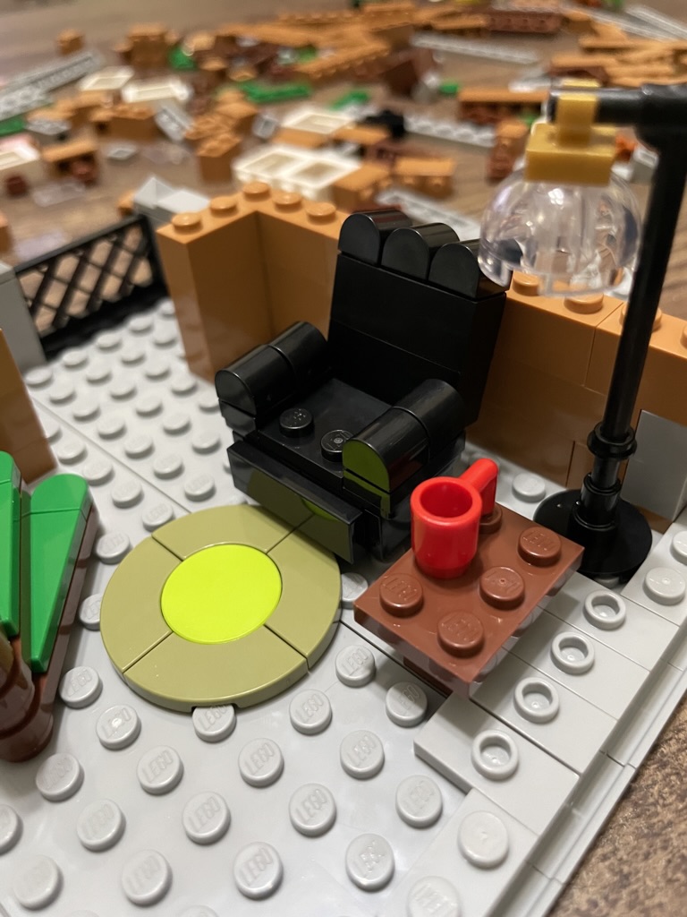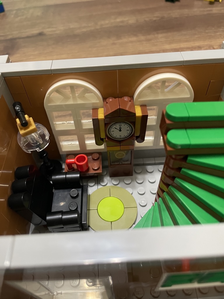 An impressive black reclining chair sits by the rug, constructed from many small parts to achieve the appearance of luxury and comfort. In the corner, next to the chair, is a floor lamp and a table (once again, with a coffee mug). The staircase continues with a white paned window with green inserts next to a full glass door to access the balcony. The final interior element is a beautiful grandfather clock beside the coffee table. It includes a print piece for the clock face. For the pendulum, a window frame holds a gold stud. It looks awe-inspiring and is one of my favorite mini-builds in this set.