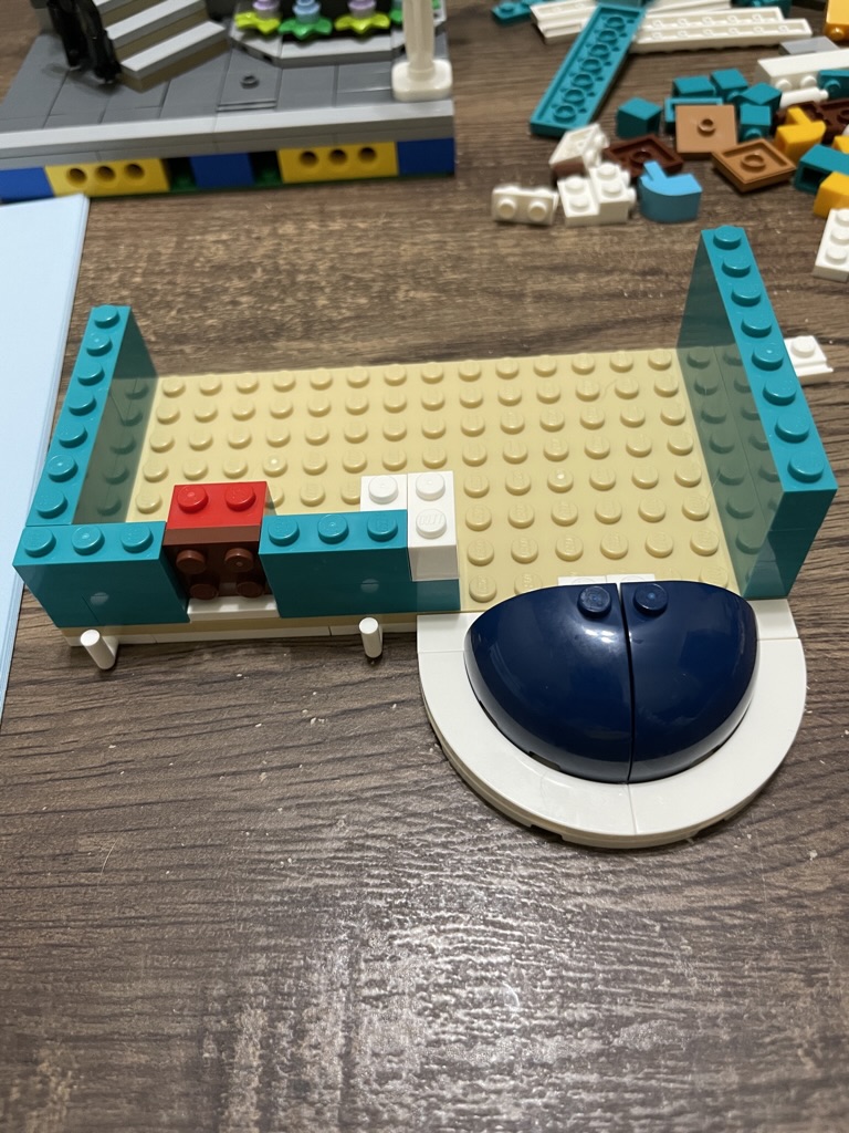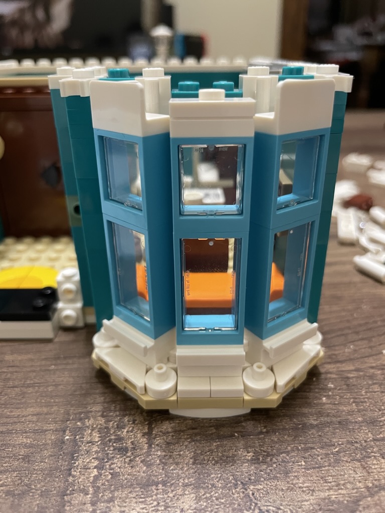 Onto stage seven of eight for the build, and these parts are for constructing the upper floor of the house. First, an 8×16 light tan plate and a 6×8 round white plate outline the footprint of the upper floor. The alcove above the bay window isn’t used as living space (shame, as a writing nook would have been delightful for a house next to the bookstore). Instead, it is covered with two large dark blue curved pieces surrounded by white tile. The walls of the upper floor are in the same vibrant turquoise as the floor below.
