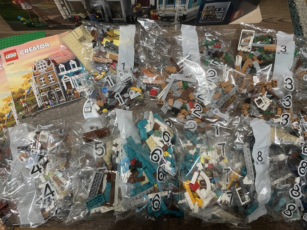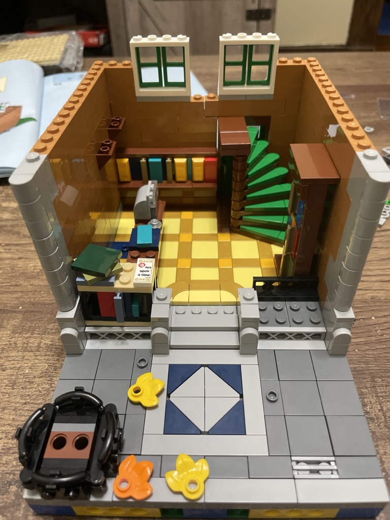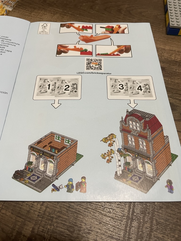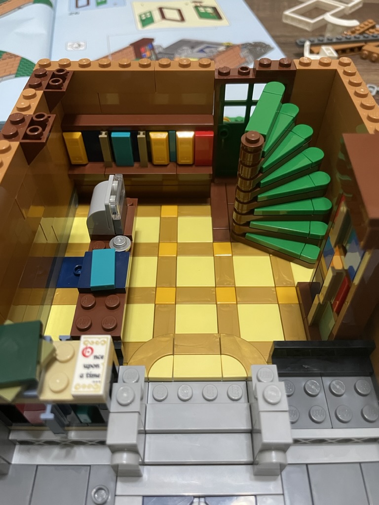 The 2504-piece set has eight build stages – split equally between the bookstore and the apartment. This set is ideal for co-building as there are two instruction booklets – one for each building. Indeed, this set is two modular buildings packaged as one.