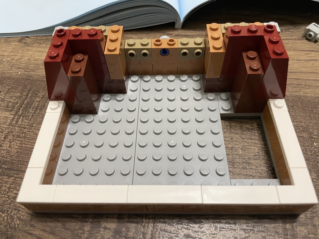 The top of the medium nougat bricks is tiled with light grey pieces, with a connection on either side to hold it in place. On the left wall, inverted slopes have been integrated that will be anchor points for the staircase. A layer of light grey plate breaks up the medium nougat brickwork.