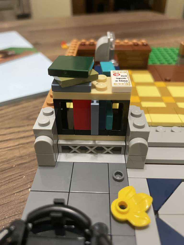 The subsequent mini-build is a small bookcase for the shop’s exterior. While petty crime must exist in the Lego city (after all, some sets are based on stolen donuts, etc.), it’s not unusual for stacks of books to be outside bookstores, so this is an excellent nod to reality. While the books are mostly 1×1 tiles, there is also a Once Upon a Time print piece.