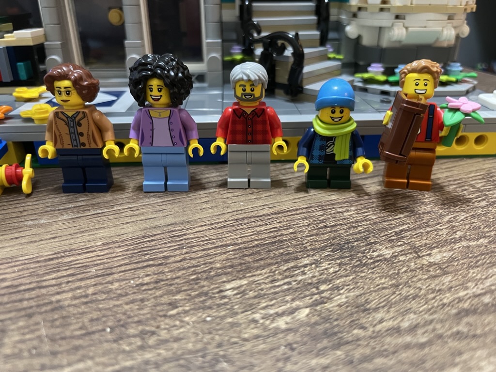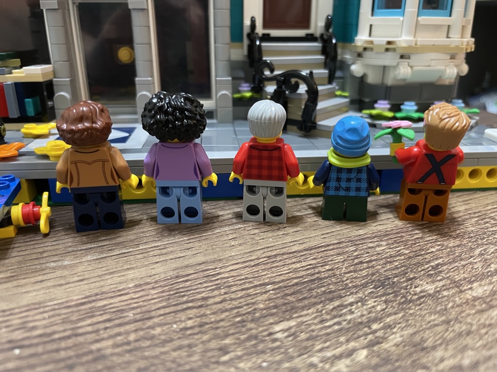 When placed together, the set does look stunning from the outside, which is all most people will appreciate 99% of the time. The set does come with five minifigures, each with fairy standard city people torso printing. The young man on the right with the flowers is holding a Moby Dick printed book, an ideal accessory. These minifigures have new printed faces, a departure from the generic faces the modular building minifigures used to have (this changed after Assembly Square).