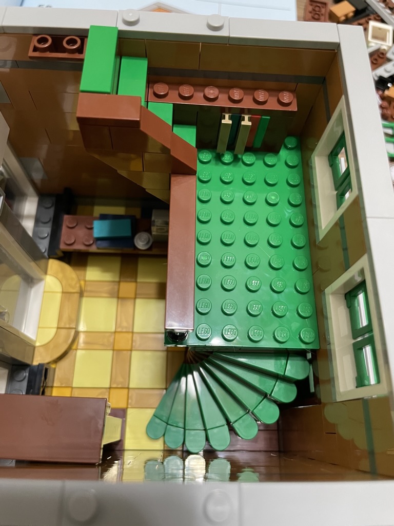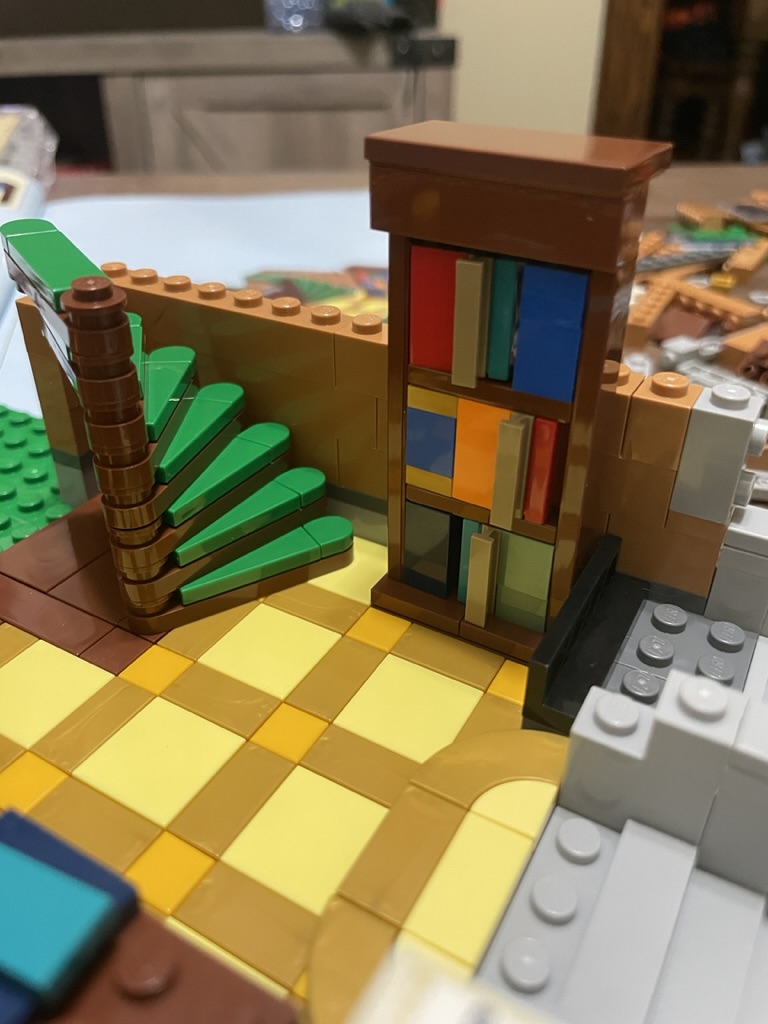 Stage three looks like an excellent selection of bricks, plates, and some smaller pieces that will add detail. Continuing the staircase is first up and uses the mounting of a 6×10 green plate between the stairs and to the inverted studs placed earlier. This creates a landing, almost a mezzanine, with a small bookshelf in the corner. The staircase continues with a classic brick and tile design, with slopes generating the banister.