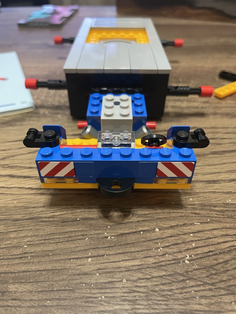 The crane road anchors are built separately before being placed onto the chassis. Symmetrically, modified 2×2 plates hold a single blue plate covered with 1×6 black tiles and two 1×2 transparent orange plates. A modified 1×2 blue brick on this base structure provides a hinge for the technic element with the red stopper attached. To hold that piece in place, red tiles, transparent orange plates, and white half curves are placed at either side. Now, the only point of articulation is the hinge for the red stopper.