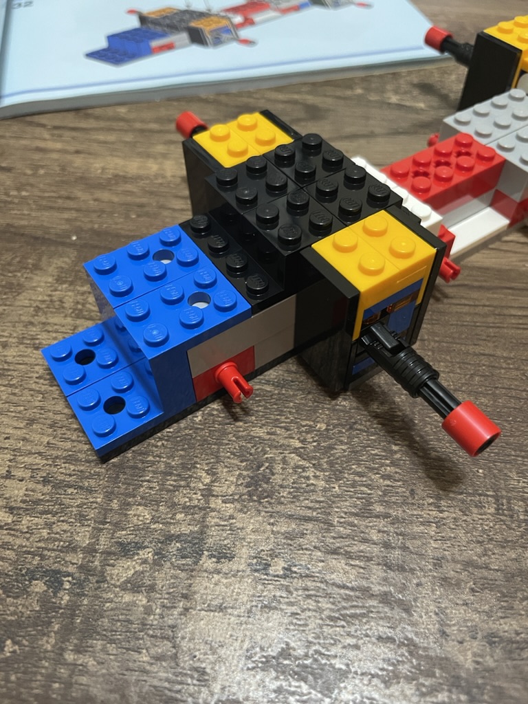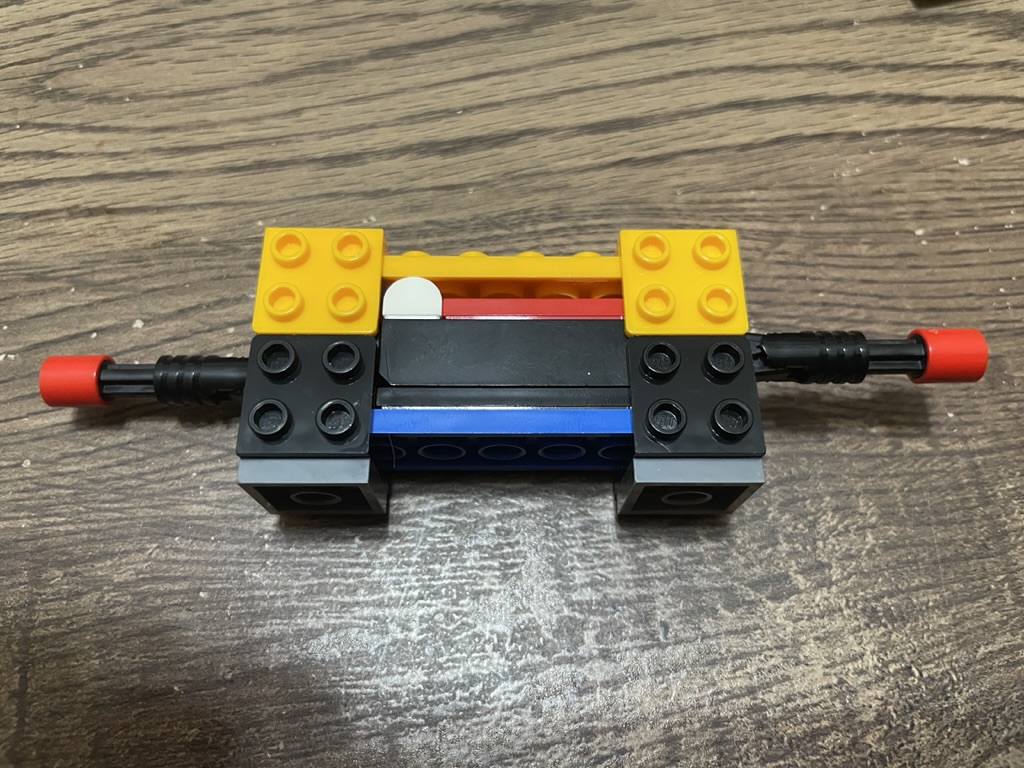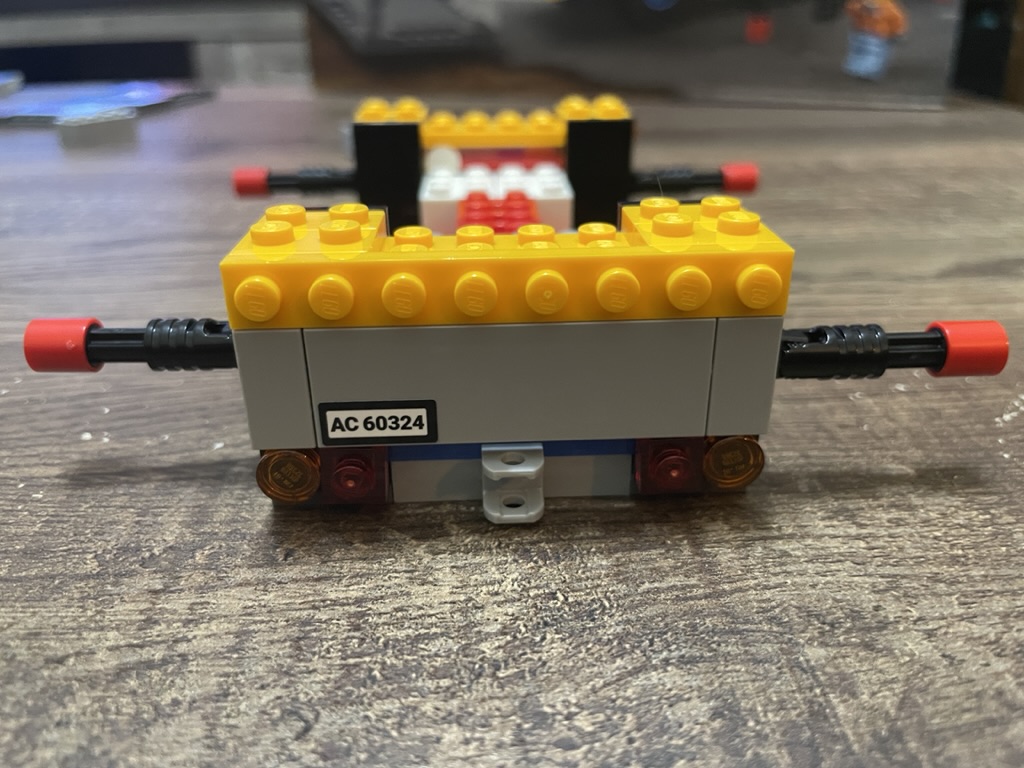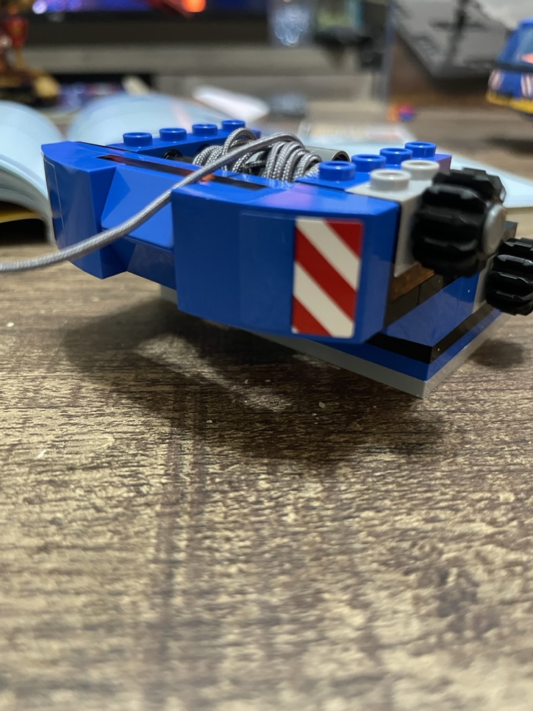 Yellow arches separate the driver from the wheels, and blue coverings are placed onto the windshields and rear bricks to enclose the driver’s section. Black ingots are used to create the large side mirrors. Finally, transparent orange cheese wedges sit at the back side of the driver’s cubby to act as warning lights.