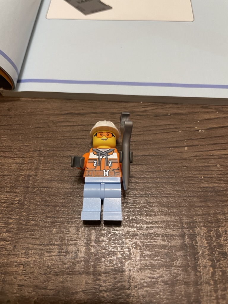 Stage two has the second minifigure – the cab operator. Her hard hat has an integrated hair element, and her face has printed glasses. The torso has a high-vis orange vest on top of a dark brown shirt, which is the color of her arms. Her ponytail extends down her back, and her utility belt has a pair of pliers tucked in. With her radio accessory, she is ready for work!