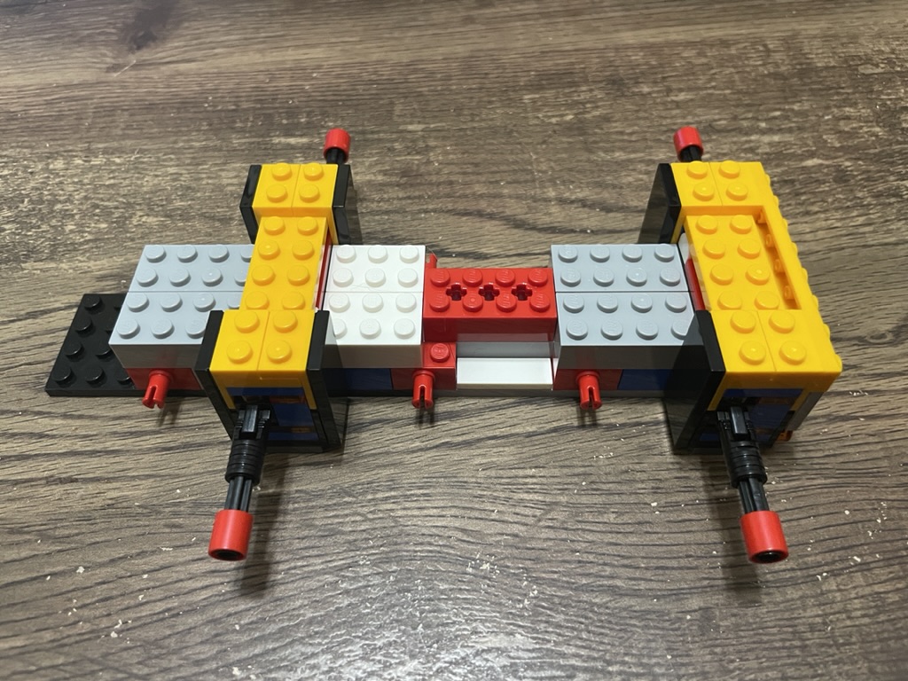 Yellow plates are used to enclose this element so that it will fit in the vehicle’s chassis. Two of these builds anchor the mobile crane to the ground at the front and rear for stability.