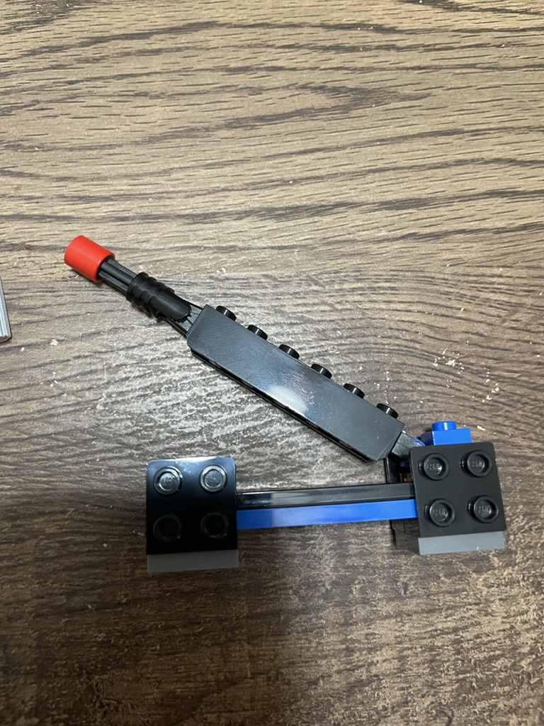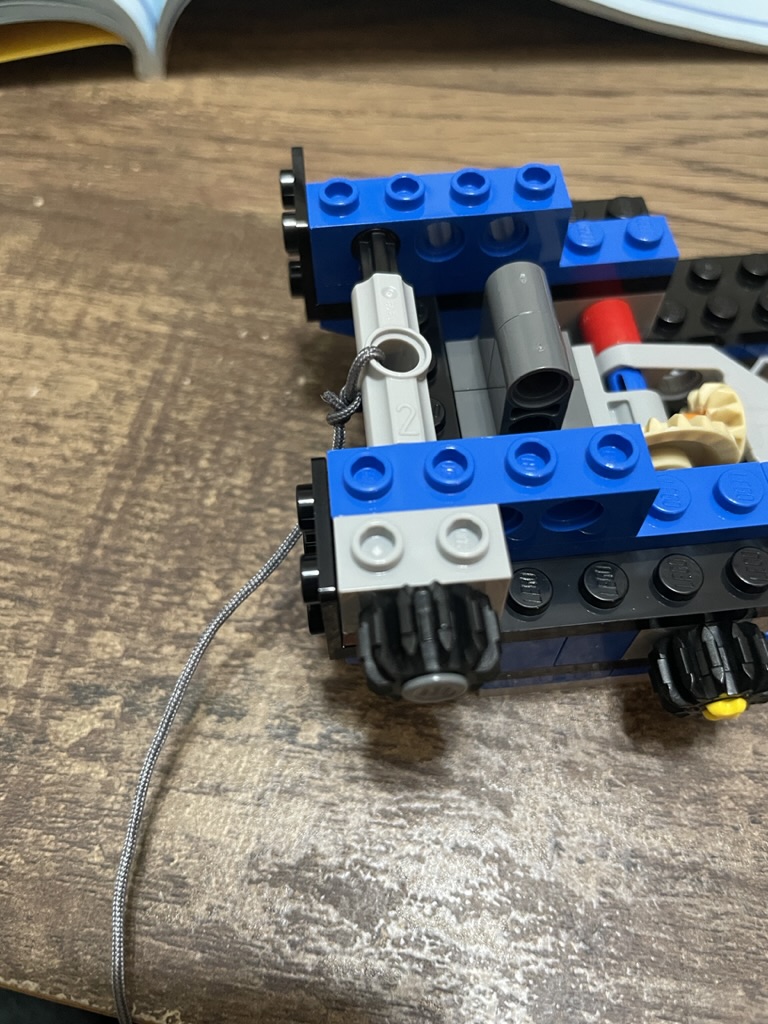 Behind the wheel rotation section, an axel is inserted into a 1×4 technic brick, onto which a light grey rod is added. The provided rope is threaded through and tied around the middle hole. The material is quite challenging to work with, and it is tricky to get a tight knot. The same structure is mirrored to hold the element in place. A knob is added to this side to control the rope length, i.e., raise or lower the hook.