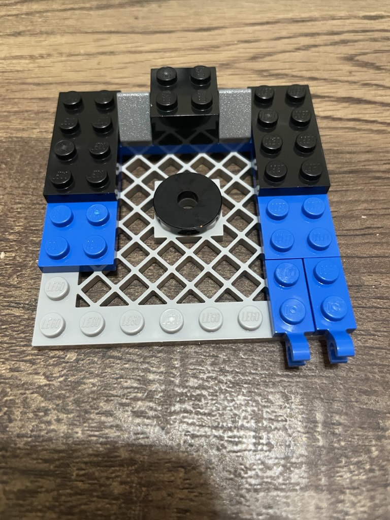 Construction begins with layering blue and black plates, with two 1×2 blue modified plates providing clips.