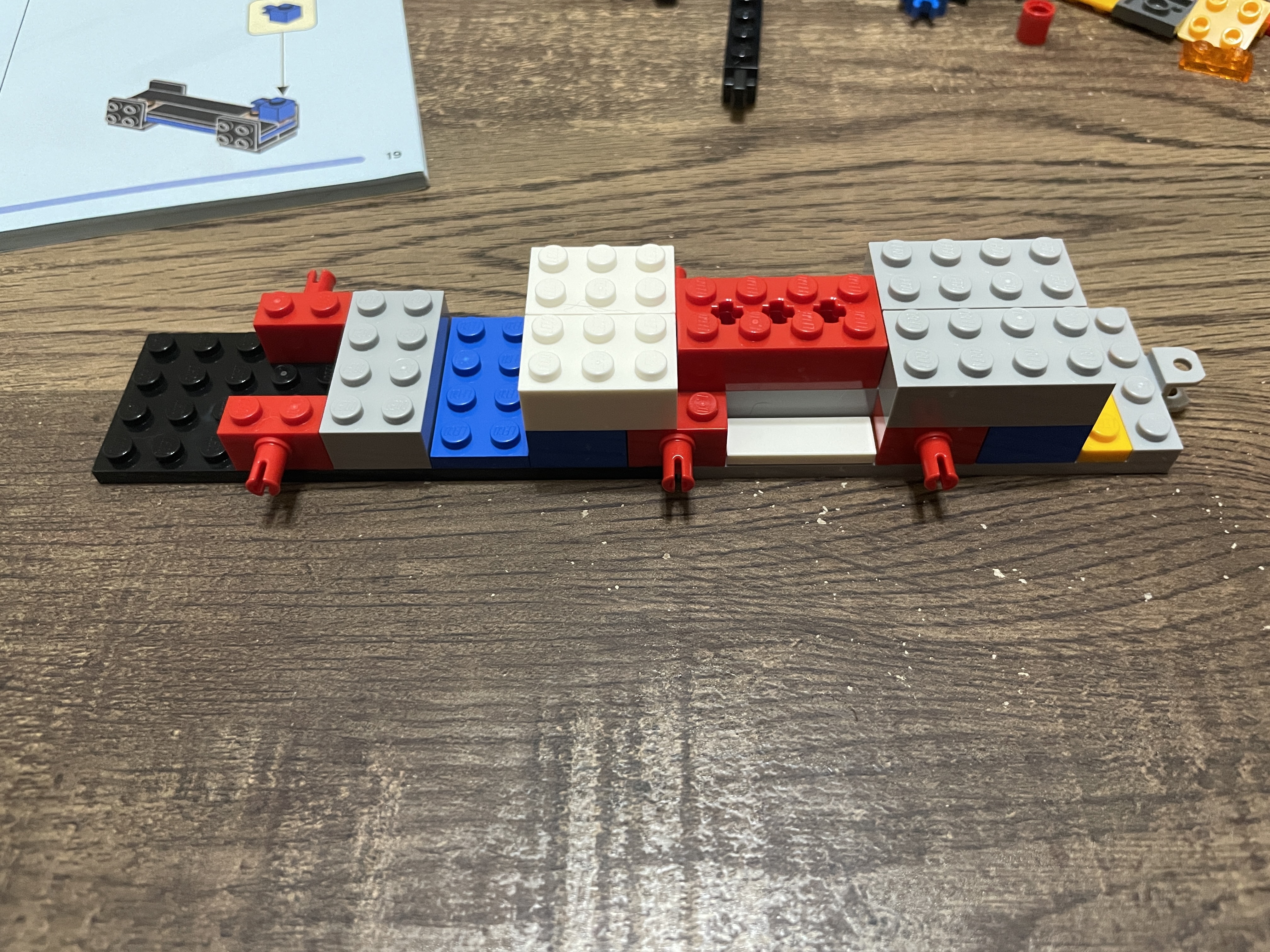 The vehicle’s core starts with a light grey plate, a connector plate at the rear, and red connection bricks for a set of wheels in the center. Additional plates with brick are connected, outlining the crane’s size and each wheel’s position. Height is added with 2×3 and 2×4 bricks, with a technic brick in the center as an anchor point for the operator cab.