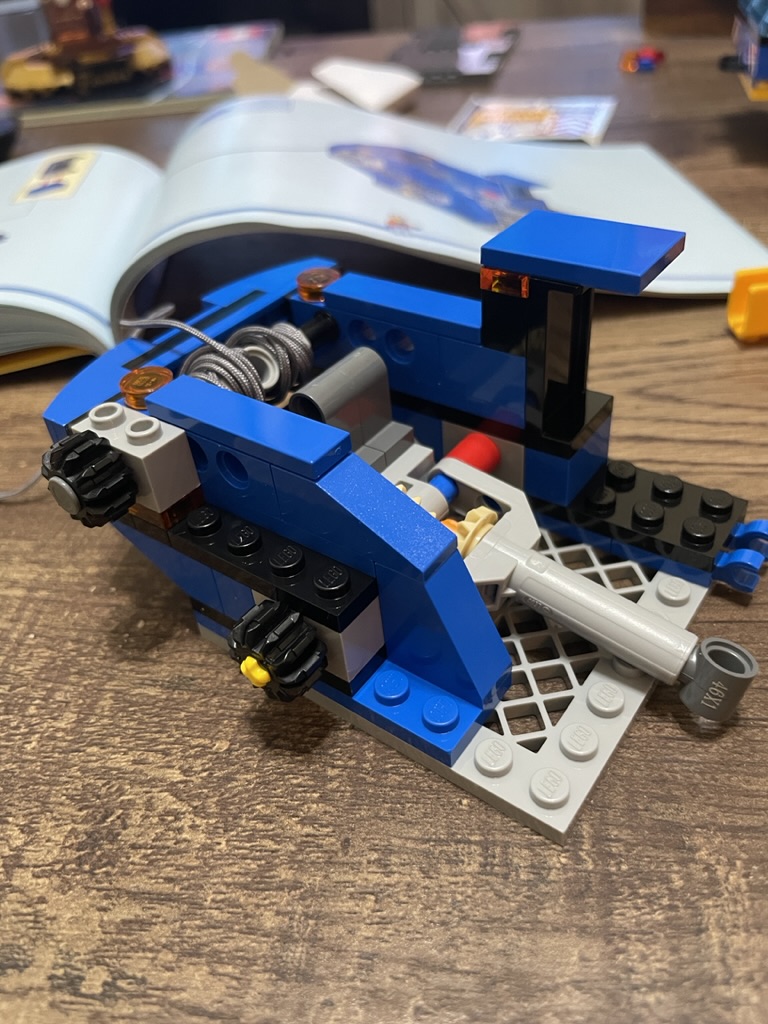 The operator’s cab’s structure becomes unmistakable on the right, with a 2×4 blue tile creating the roof. Sloped, transparent blue windshield clips into place and two levers are provided so our minifigure can control the hook and boom. It is a simple yet effective building and part usage. An overview of the cab shows the build is almost complete.