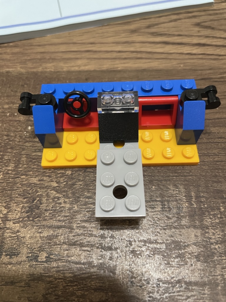 The driver’s compartment is built separately from the vehicle and begins with a yellow plate with blue and transparent plates added to an edge. A black 2×2 ring connection overhangs the yellow base. The section’s structure is quickly apparent after adding the steering wheel and a center console. A black 1×1 modified plate creates clips for the side mirrors on each flank.