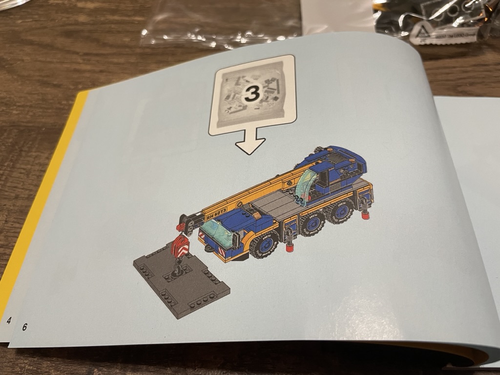 This 340-piece set comprises three building stages covered in a single 148-page booklet. Stage one focuses on the internal structure of the crane, stage two completes the main chassis of the vehicle, and stage three constructs the operator’s cab, boom, and hook. There is a small sticker sheet for detailing and a single road plate.