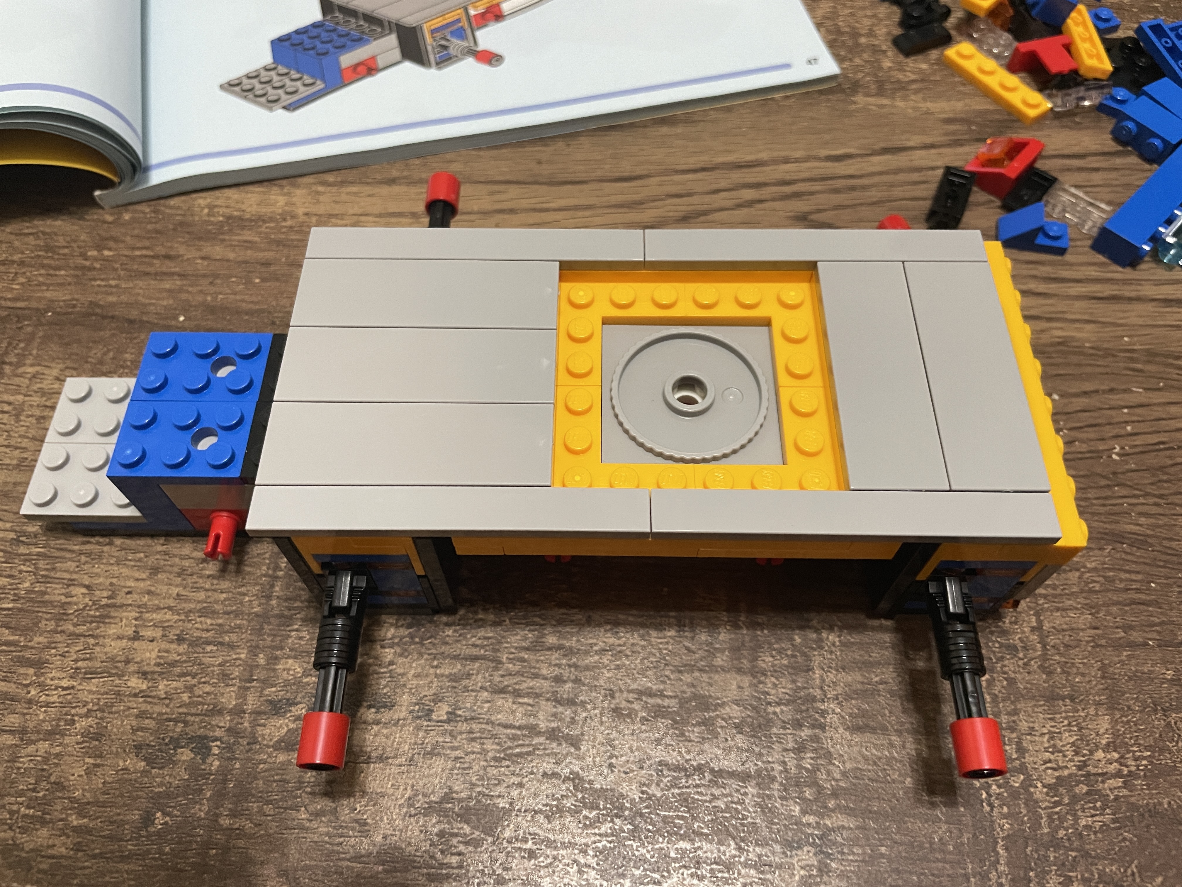 Yellow plates then enclose the inner pieces before tiling the surface with light grey tile. The tile provides a smooth surface for the cab to move across by reducing friction.