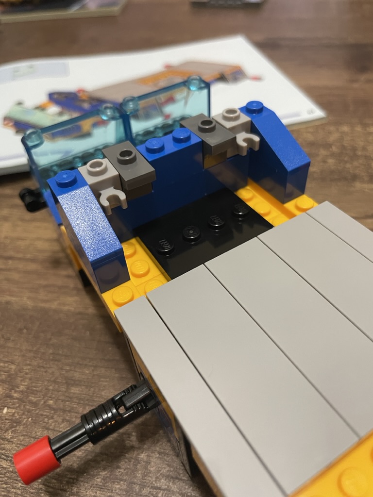 The driver’s section is elongated with a light grey plate, to which a black minifigure plate and a silver modified v-connection plate are mounted.