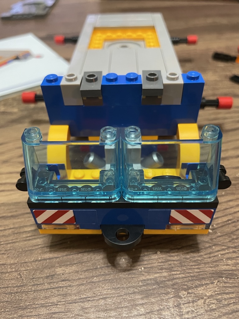 Two transparent blue windshields sit at the front, while a brick wall encloses the driver’s cabin from the rest of the crane. At the back of the wall, two modified 1×1 light grey bricks with clips are placed that serve no particular purpose but are a great spot to put the accessories!