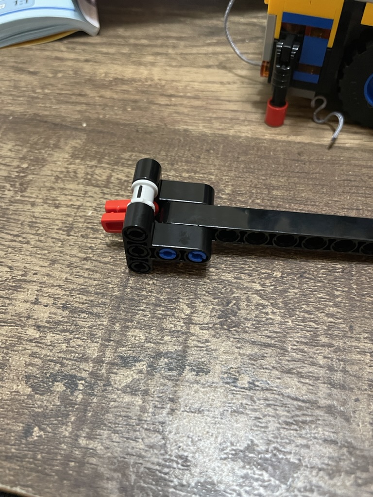 The dark grey bracket connects to either side of the internal structure and is held in place with an axel. Once in position, the crane overhangs the front of the vehicle.
