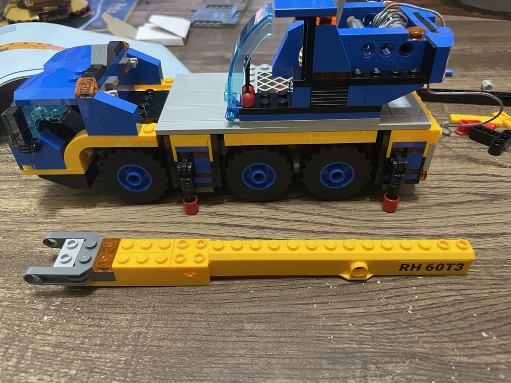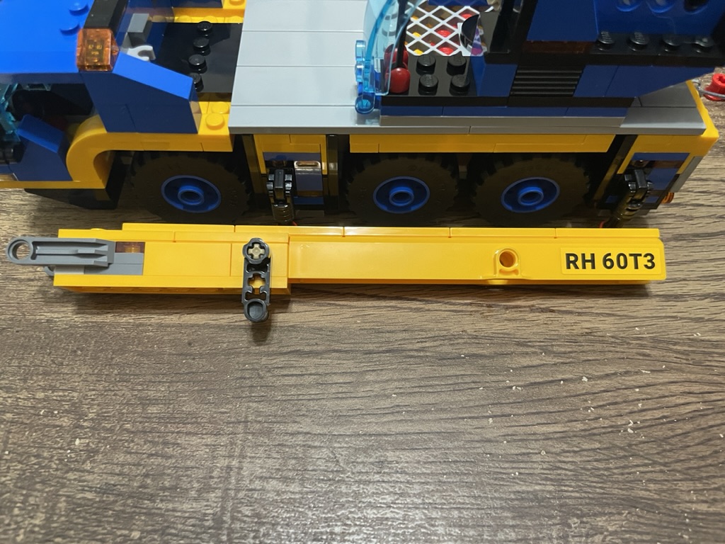 The final element is the boom, which is primarily a specialized piece. To that, a sticker is added to each side, providing the boom with its working number. At one end, additional plates and bricks increase the length and give the necessary parts to connect the boom to the cab. The entire element is tiled with yellow pieces for a smooth and polished finish. From the side, you can appreciate the dimensions of the boom – it’s not small!