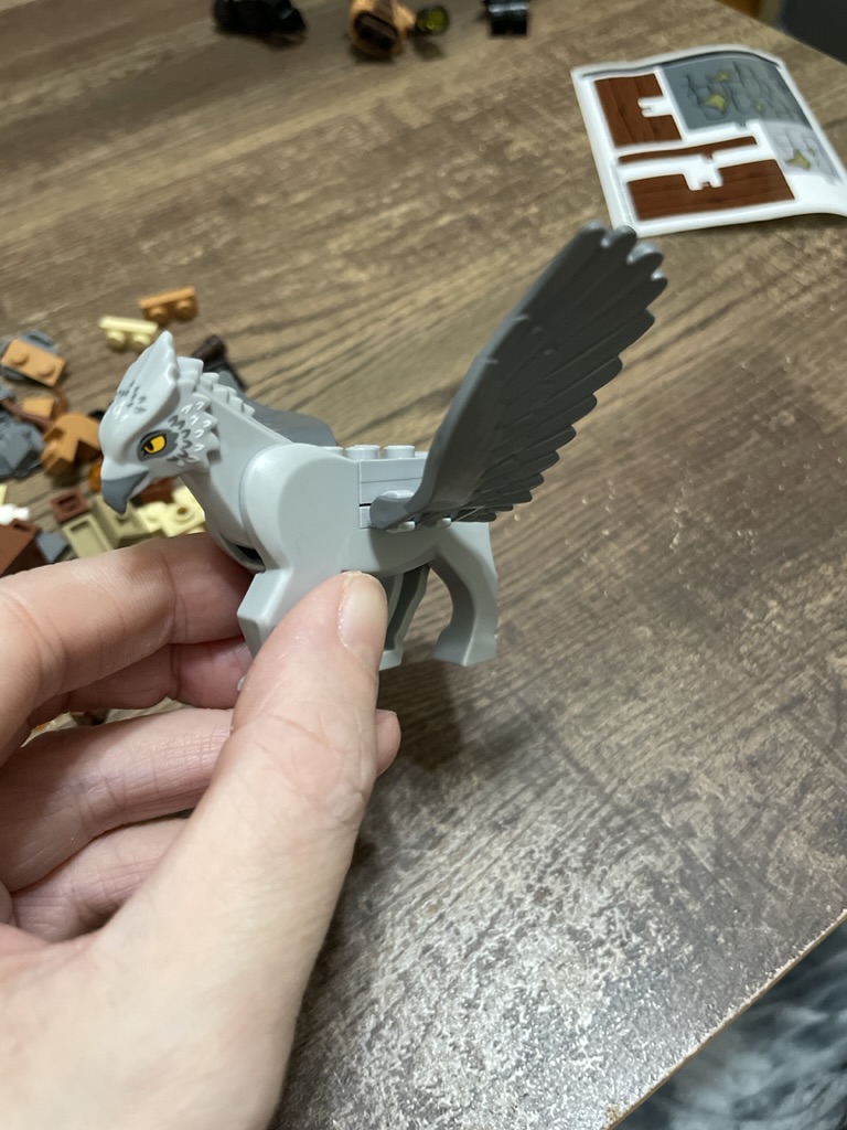Buckbeek has excellent feathering detail on the head, including coloring. The large feathers are molded pieces that clip to each side and look spectacular. Open studs are left on Buckbeak’s back to allow a minifigure to sit on their back.