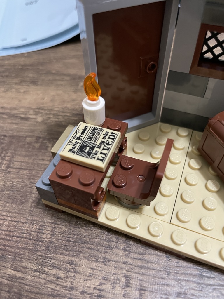 A small window is built next to the door, which is given the same sticker as the other – to look like wood panels. The same exterior design is recreated – with light and dark grey bricks, tan tile, and olive tree limbs creating the detailed exterior. With a smaller interior, the furniture and decorations are sparse. By the door sits a chest, and against the other wall is a desk with a candle. A lovely printed 2×2 tile representing the Daily Prophet sits on the desk.