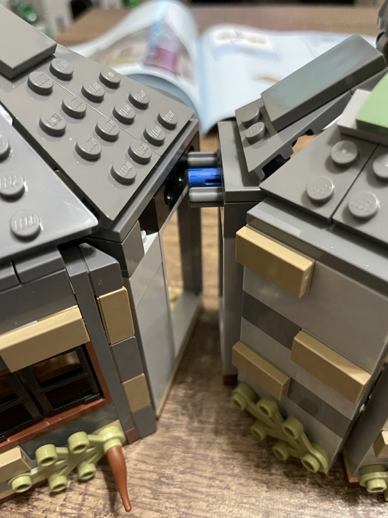 A door panel creates the fifth and final wall allowing the roof structure beam to be attached. Various items are connected to each clip – a bucket, spoon, cleaver, pan, and rope — all the things Hagrid might need to make dinner.