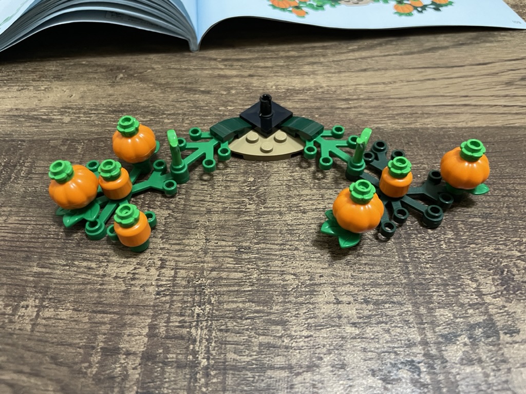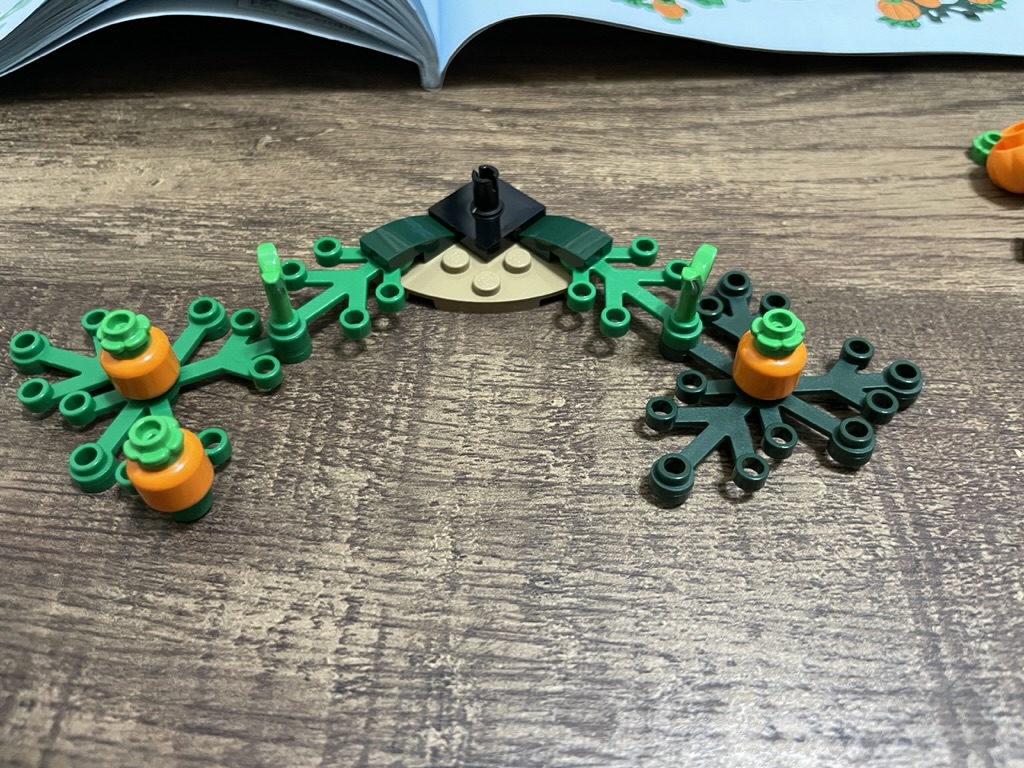 To complete the set, there is a mini build of the pumpkin patch that Buckbeak is rescued from. A curved tan palate forms the base, to which bright green tree limbs are attached with dark green slopes. Onto those, other tree limbs are connected with plant elements. Pumpkins and orange heads are placed on the tree limbs to create a rich and compelling pumpkin patch. Finally, small green flowers are placed on top of the heads and pumpkins to complete the look.