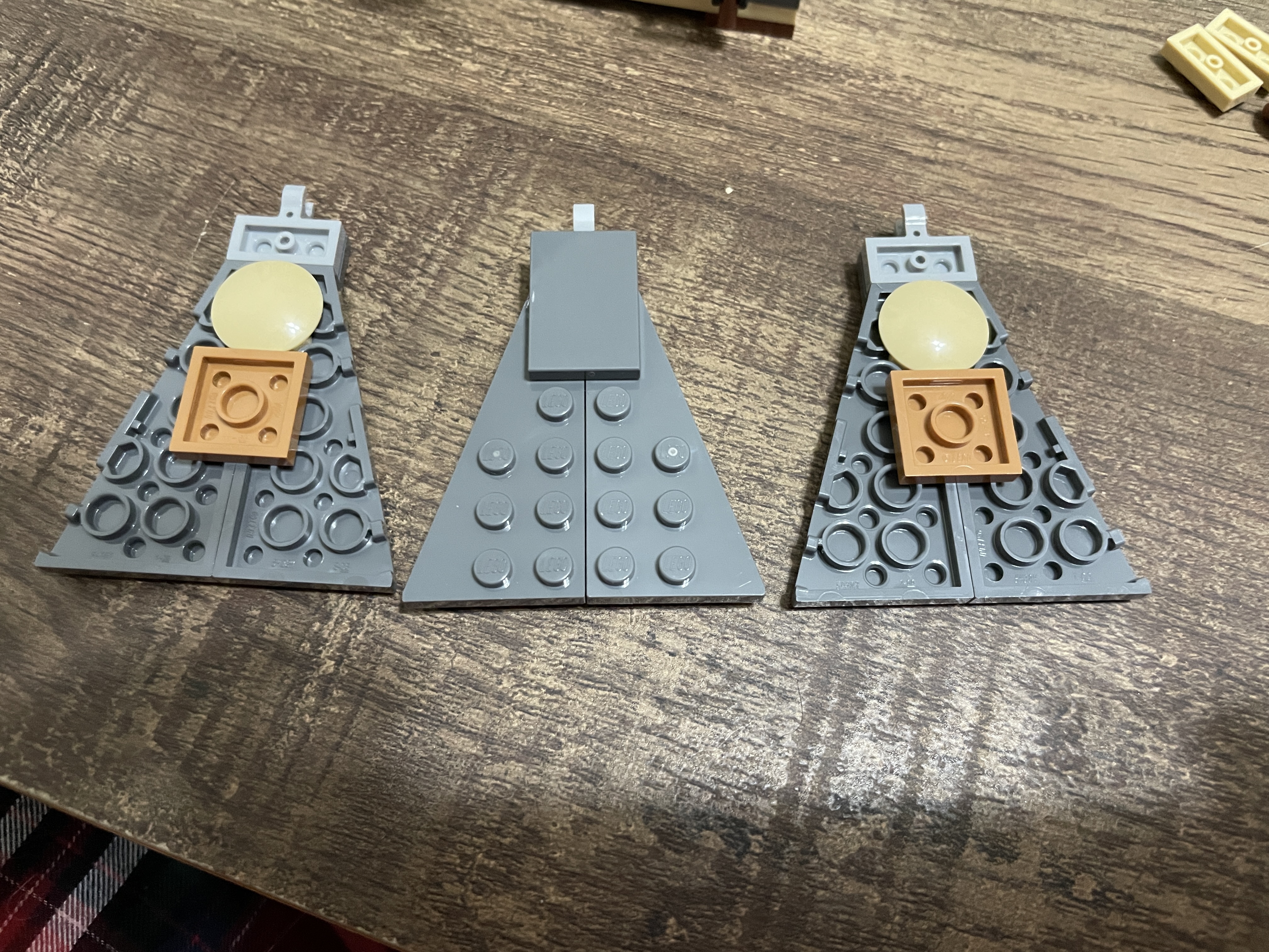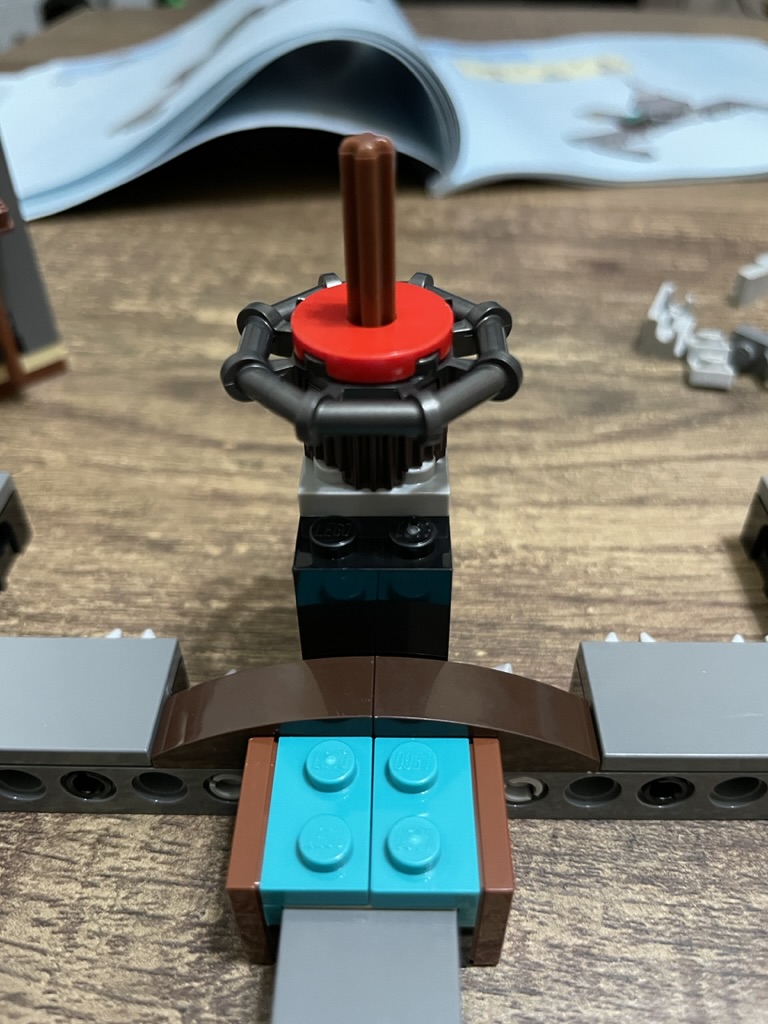 The roof uses technic elements to generate a frame for placing clips. The roof is tiled off with dark grey, onto which the roof sections will sit. The rooftops use an axel to support a hexagonal connection ring and a mix of dark and light grey elements to generate the pointed roof design.