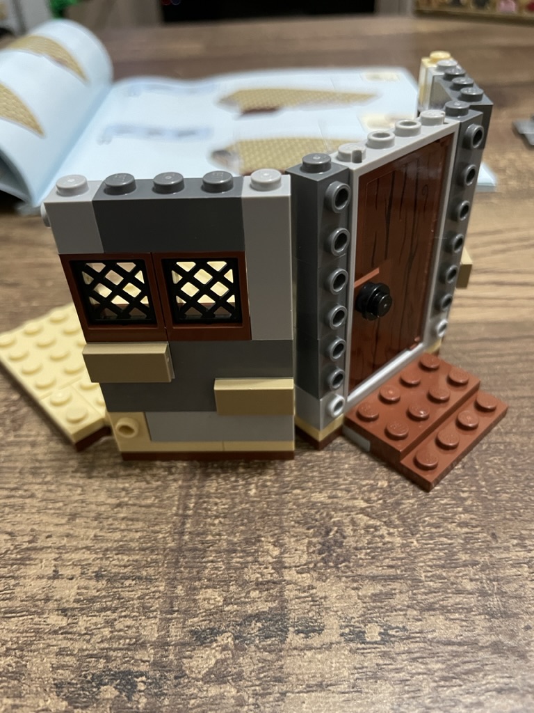 The next stage constructs the smaller of the two hut sections, with the build starting similarly – with the plates creating a solid base. This time, the door is on the side and has a smaller floor plan.