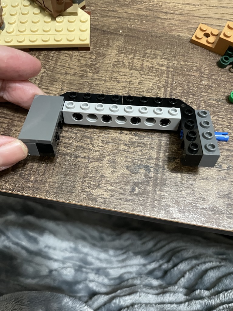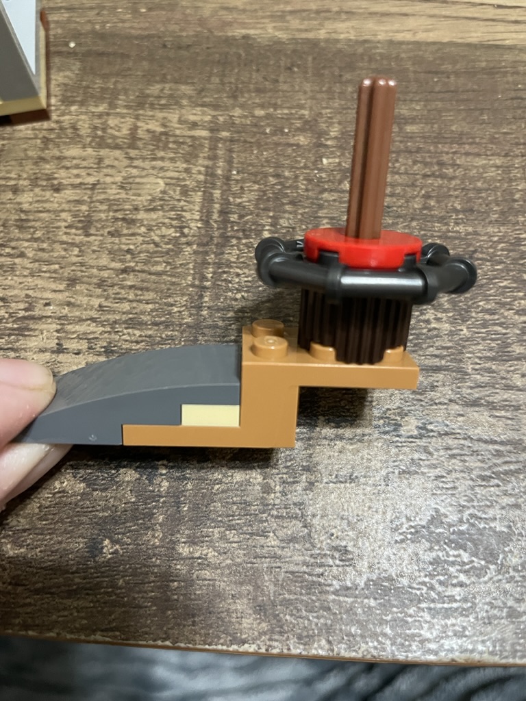 The top of the building is made from the same parts as the ones used in the last hut, with a hexagonal ring held in place with a central axel.