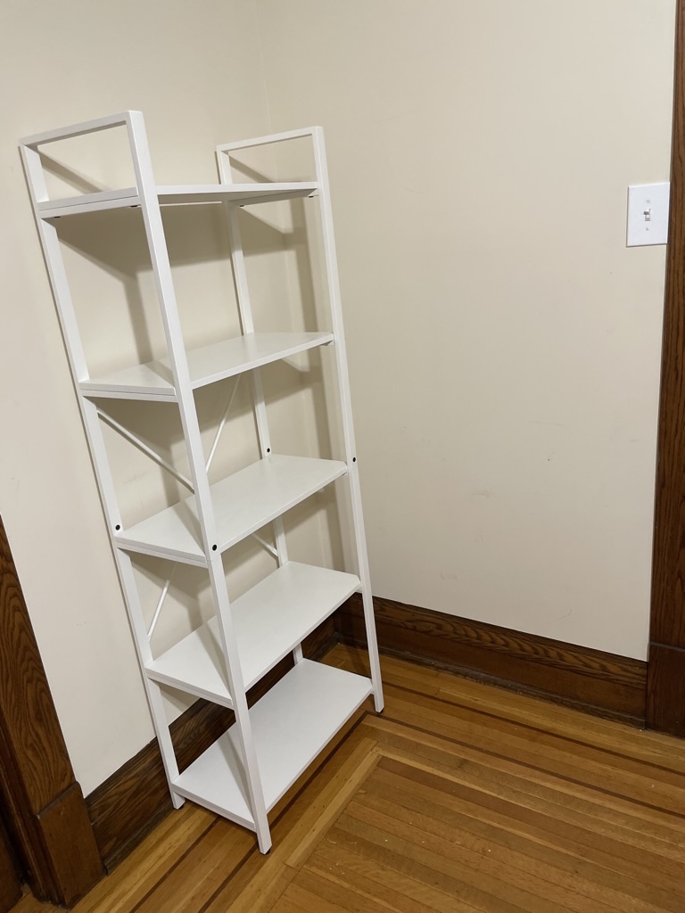 Like my desk, I wanted white shelves so nothing would distract from the Lego. IRONK made a matching shelving unit (to the desk) at a reasonable price point, so I went with that to have some uniformity in the room. Naturally, I will need another, but hopefully not until Christmas! It has five tiers and is open at the back and sides so that you can appreciate the sets from many angles.