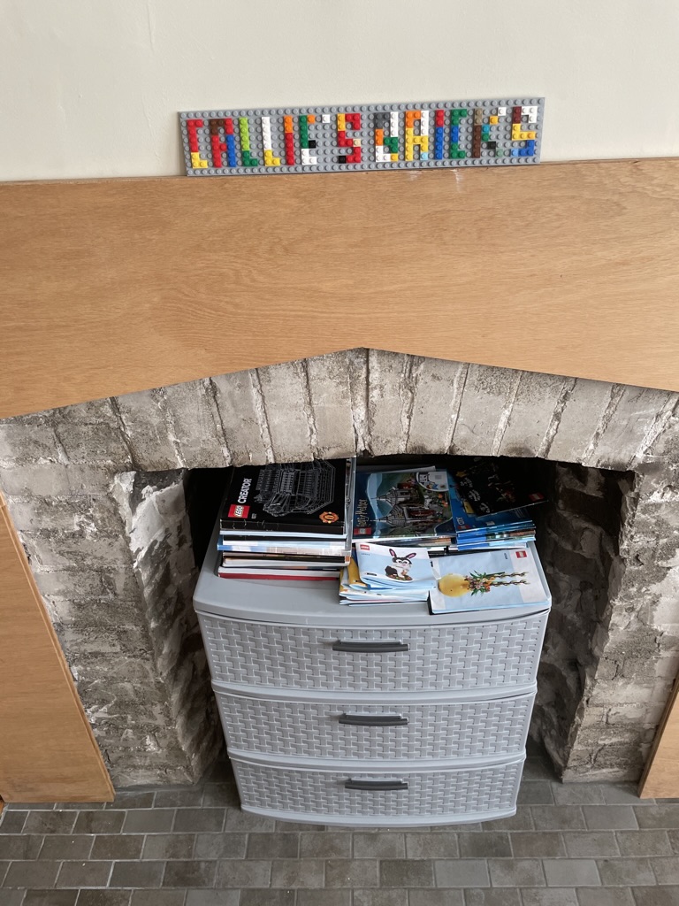 In the fireplace is a little storage unit with items from the bulk lot I snagged back in November. It’s a sorted mess that I need to work through (pieces with stickers, vehicle components, and half-built sets I will restore). On top of that, I have my manuals – I know I’ll need a better storage solution for these soon too. At least they are all in one place and not dispersed all over my house. Above is a cute sign my friend made for me!
