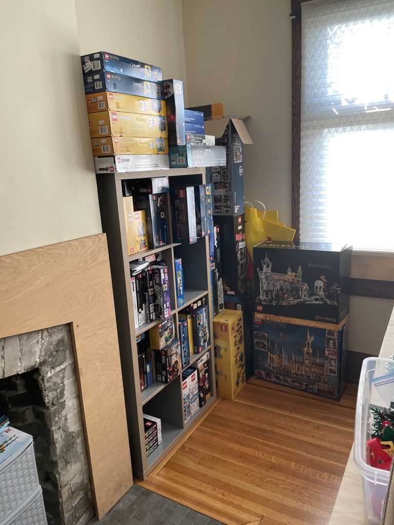 The IKEA Kallax unit with my backlog is to the right of my fireplace. It’s sorted by theme (Harry Potter, Creator, City, Marvel, Gift with Purchases, etc.), so finding my next build is straightforward. Beside those are my large open boxes, which I keep flat-packed empty boxes in. Once they are full, I will move them from the room into a long-term storage area.