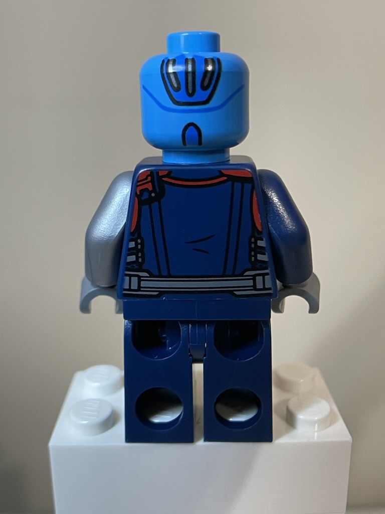 The Guardians’ suit is a beautiful navy blue with red structural detail. The torso is complete with a belt and the Guardians logo in the center of the chest. The legs have pockets, knee detail, and toe printing — no side leg or arm printing on these figures.