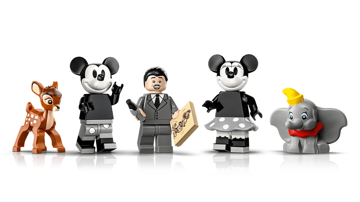 While the model’s attractiveness drew my attention, the minifigure selection with this set is mindblowing. The first-ever Walt Disney minifigure is included, complete with a pen and a printed tile with a Mickey Mouse sketch. Two of his most iconic creations – Mickey and Mini Mouse – are the other two provided minifigures. They’re monochrome characters (similar to the Disney CMF Series 2 figures) representing their earliest iterations.