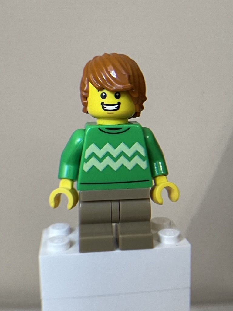 The boy’s bright green torso is printed on both sides with a white zig-zag pattern, creating a fall sweater. His outfit is completed with short dark tan pants. He has a fantastic youthful hairstyle and a massive wide grin. This happy kid is ready to enjoy a weekend at the holiday home.