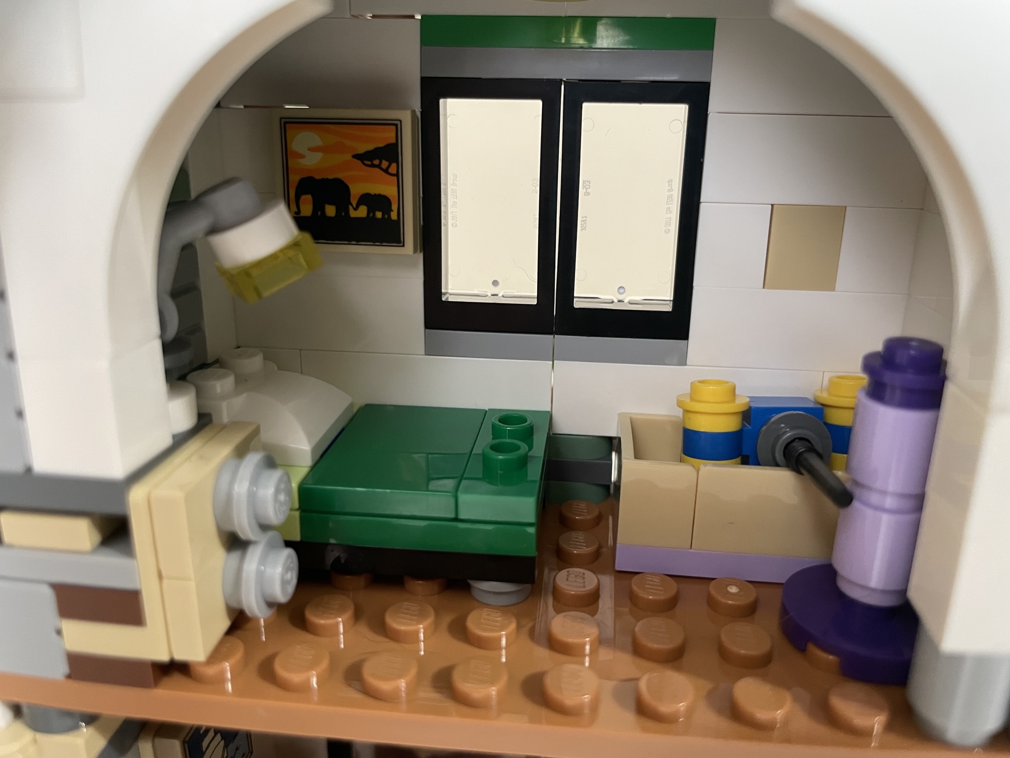 The living area is beautifully furnished with a fireplace, a comfy couch, a side table, and a printed tile picture. I can easily envisage the minifigures resting here after a day of exploring. The bedrooms include furniture, side lamps, a toy chest, and pictures. The Lego beds look comfortable too!