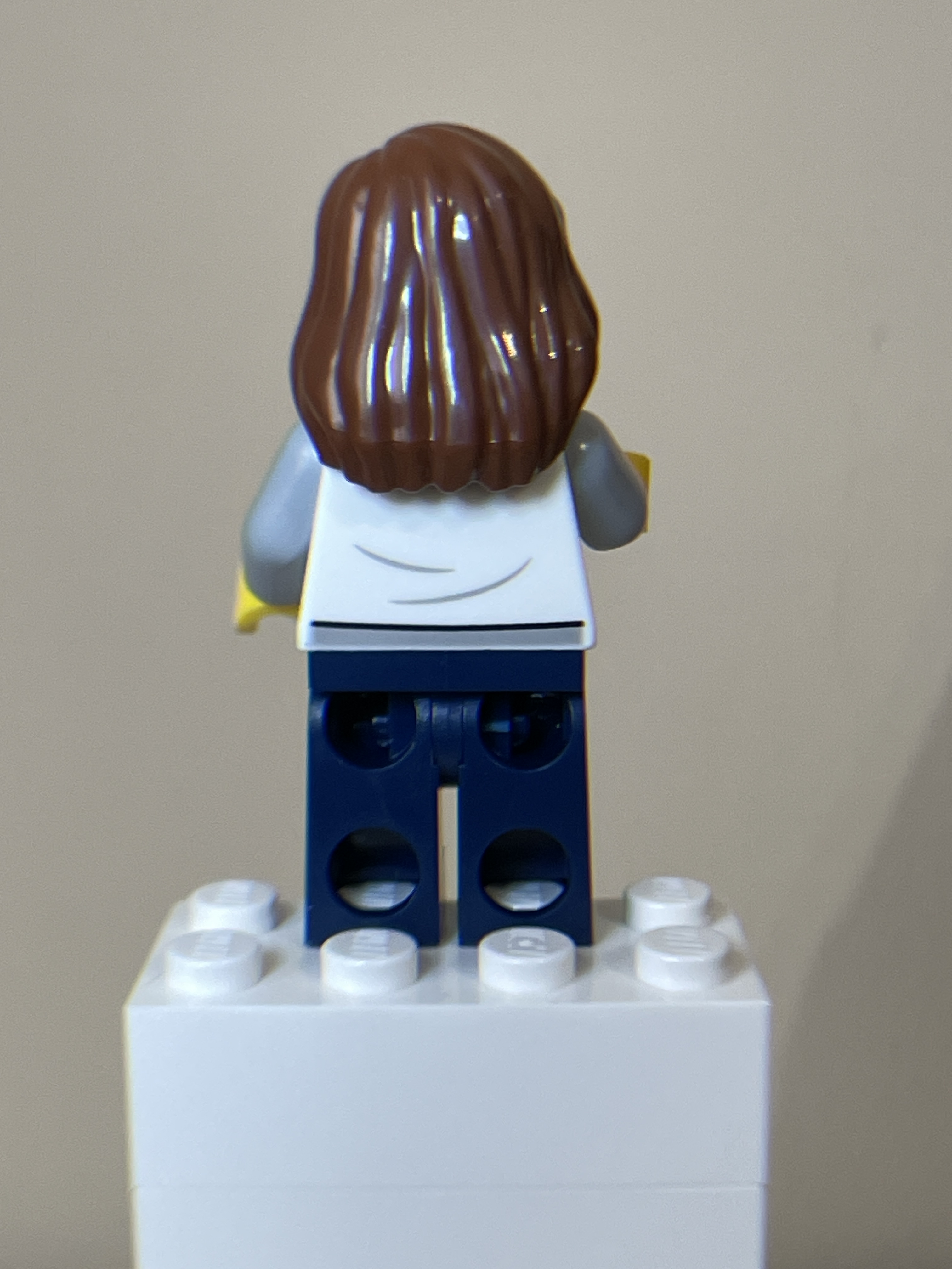 The adult female has a fun torso printed with the Lego adventure Logo (a pattern seen on several sport-themed sets). The bulk of the sweater is white with light grey arms. Fabric marks can be seen on the back too. She has long dark brown hair and a massively happy expression.